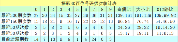百位分析:最近50期表现较热的号码有:2出现8次,9出现7次,5、8出现6次;表现较冷的号码有:0、3出现2次,7出现4次。出号奇偶比为24:26,012路比为16:14:20。本期该位绝杀两码6、9,参考号码3、5、7,精选一码3。